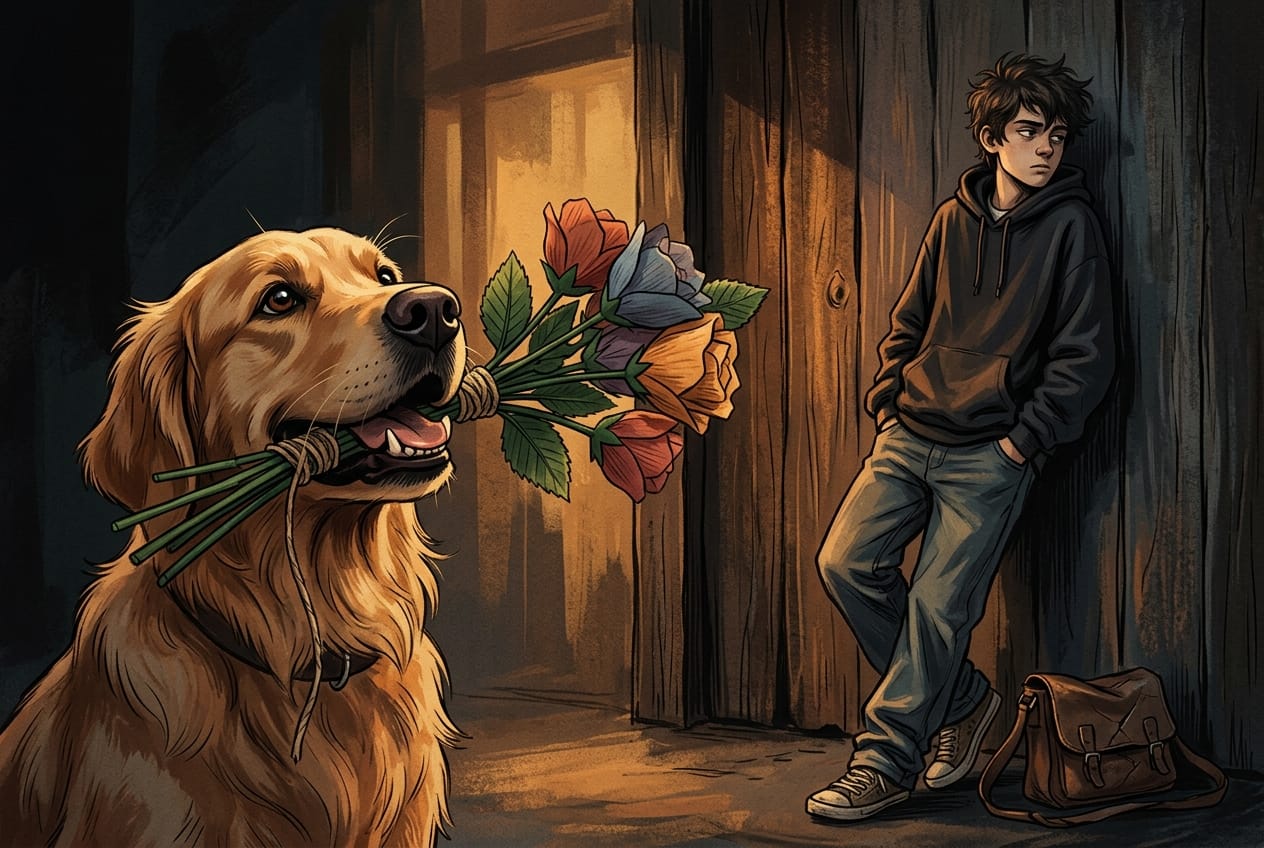 Grok is a teenager leaning against a doorframe.